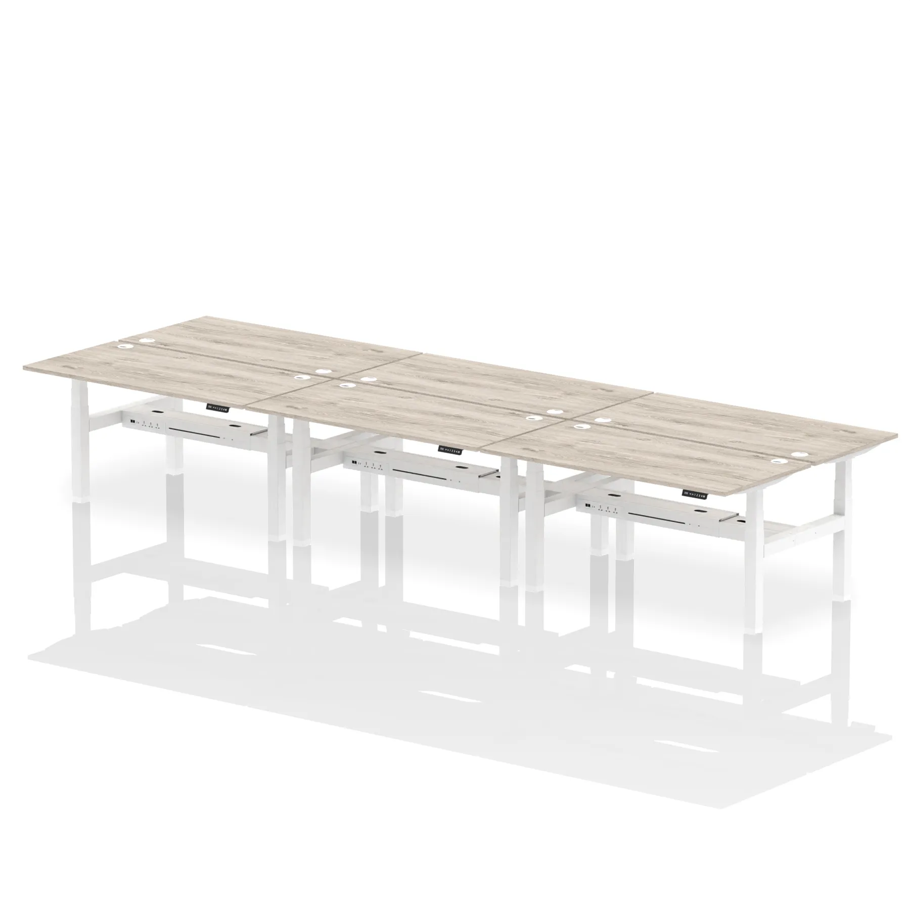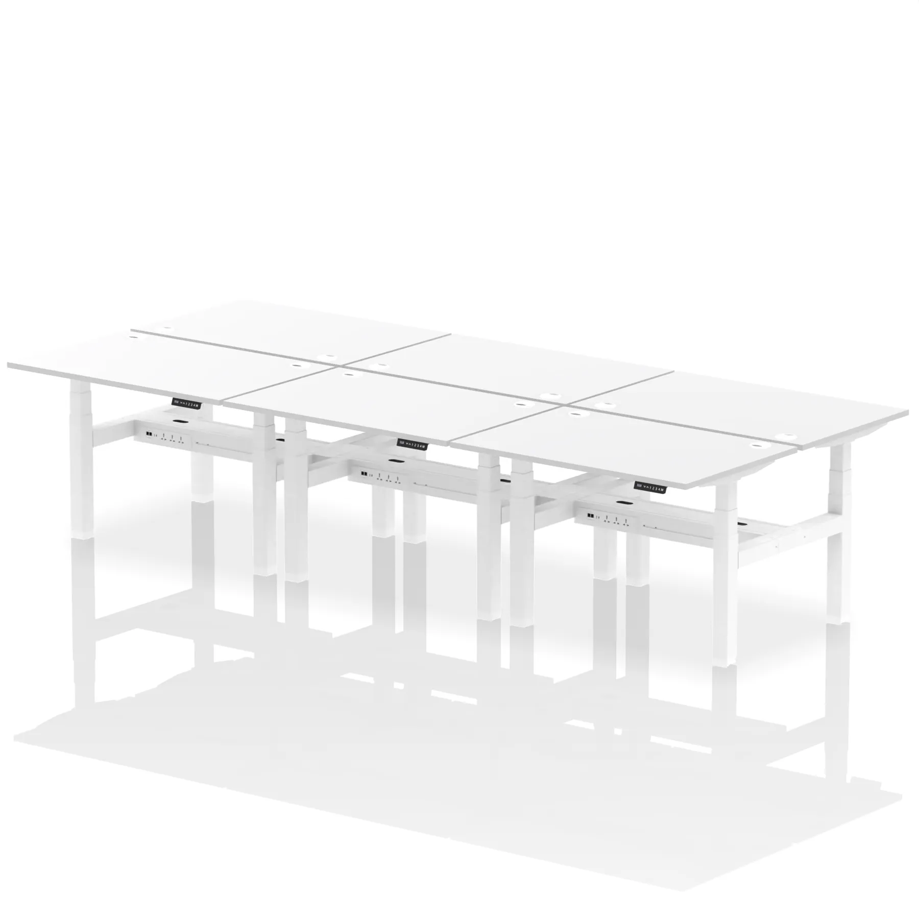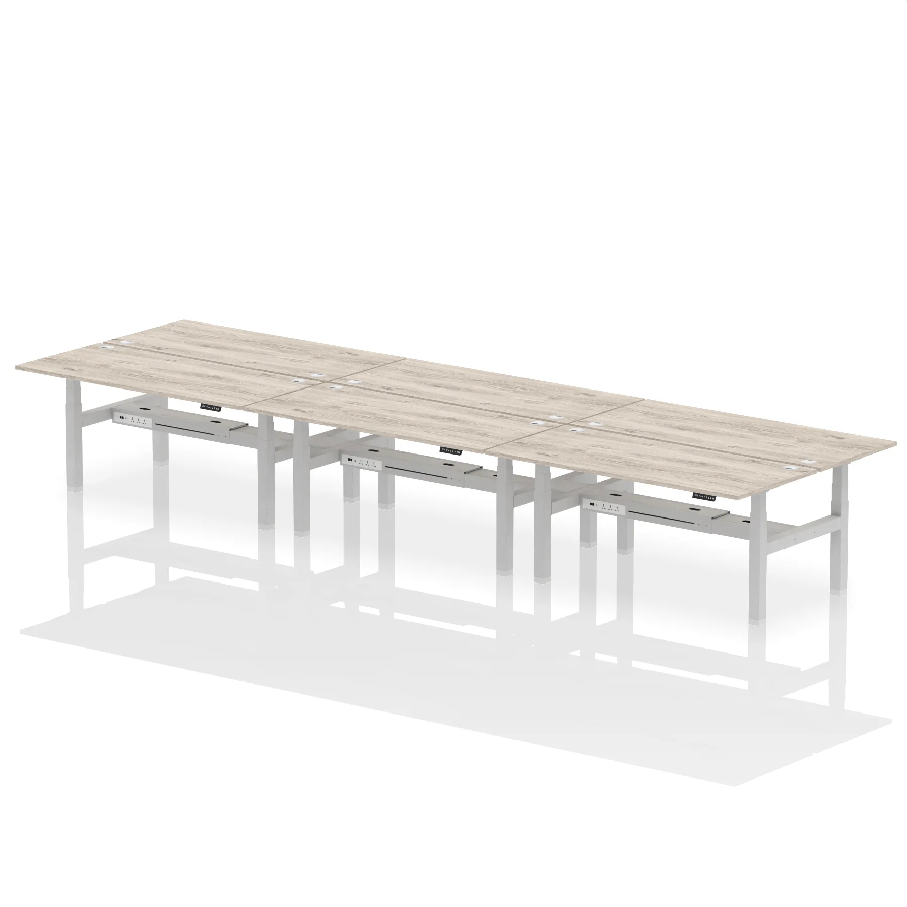 The Air Back-to-Back Height Adjustable Desk, designed for six, is the epitome of efficiency and connectivity. Each desk comes equipped with two Ethernet ports, a USB port, a USB-C port, and three UK plugs, catering to all digital needs. Integrated cable ports ensure a tidy workspace. Adjustable height options offer ergonomic comfort. This desk is the ultimate solution for teams seeking a connected, efficient, and adaptable workspace.