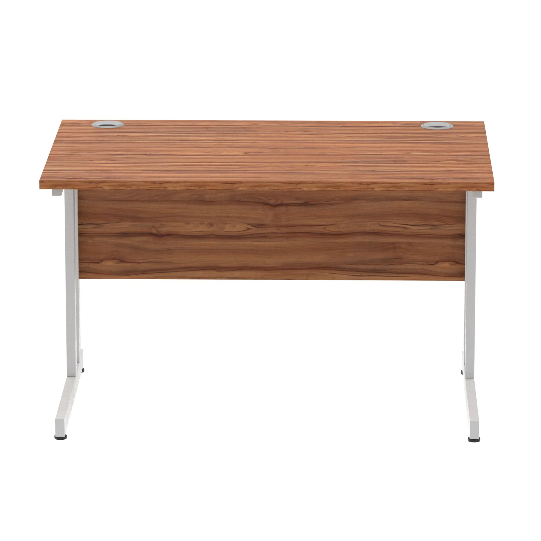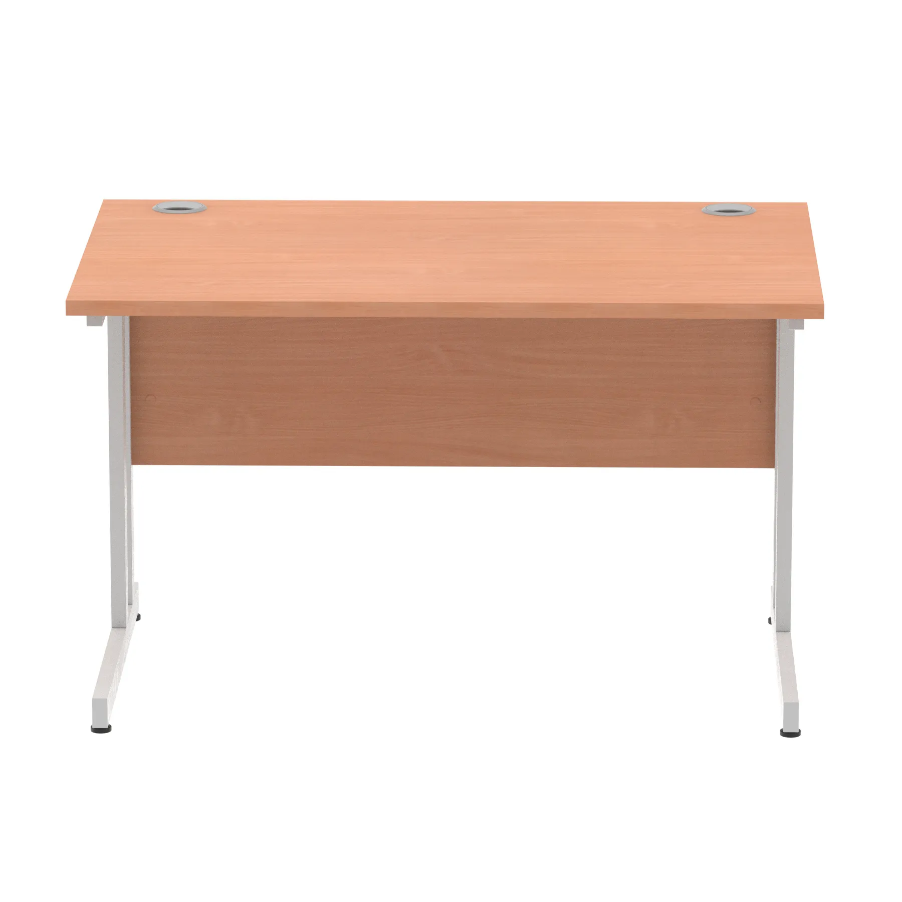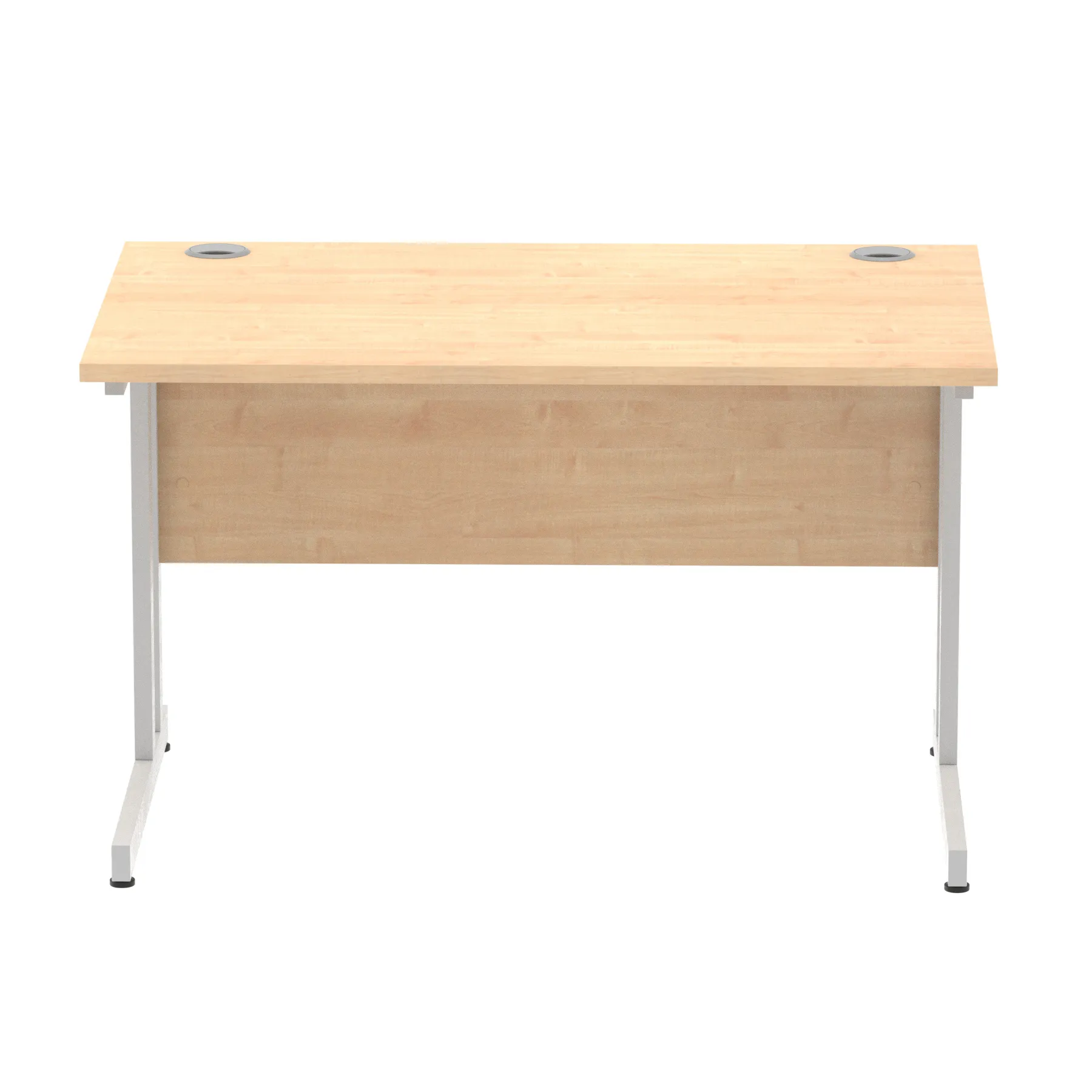 Impulse contract desk | 25mm tops | Heat resistant melamine finish | 18mm modesty panels | 2mm protective abs edging | Silver coated double strut legs | 2 cable ports | Height adjustable feet | Steel to steel fixings | 2 modesty panels slots| Deep set modesty panel (5″) allows for compatibility of most screen clamp fittings | Weight Capacity 135Kg