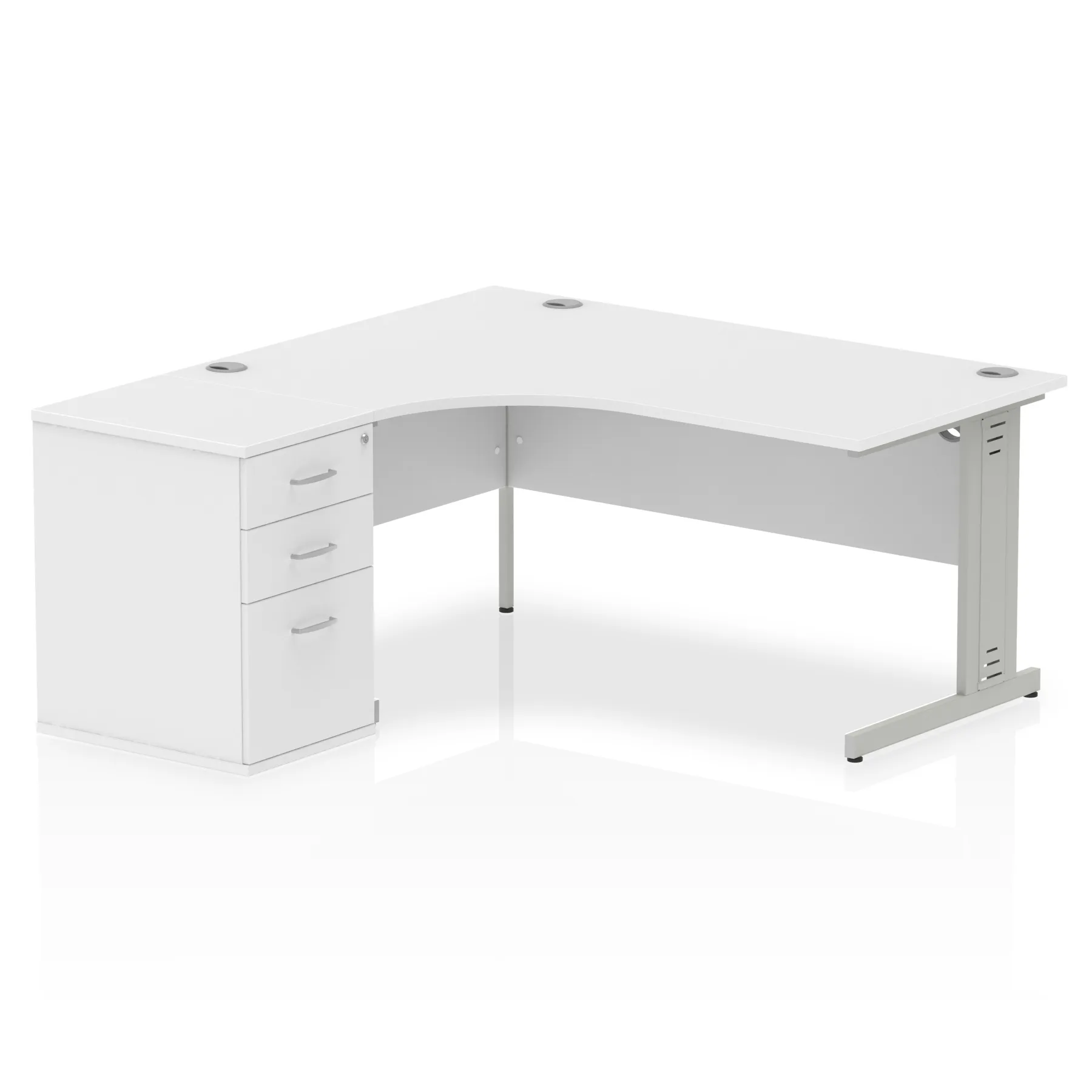 • Impulse contract workstation • 25mm tops • Desk and pedestal combined • Heat resistant melamine finish • 18mm modesty panel • 2mm protective abs edging • Double strut legs • Multiple cable ports • Height adjustable feet • Steel to steel fixings • Modesty panel slots wire slots • Deep set modesty panel (5″) allows for compatibility of most screen clamp fittings