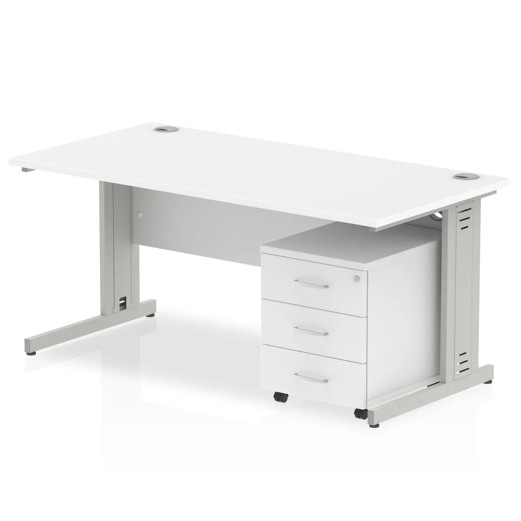 Impulse contract workstation | 25mm tops | Desk and pedestal combined | Heat resistant beech melamine finish | 18mm modesty panel | 2mm protective abs edging | Silver coated double strut legs with cable management | Multiple cable ports | Height adjustable feet | Steel to steel fixings | Modesty panel slots wire slots | Deep set modesty panel (5″) allows for compatibility of most screen clamp fittings