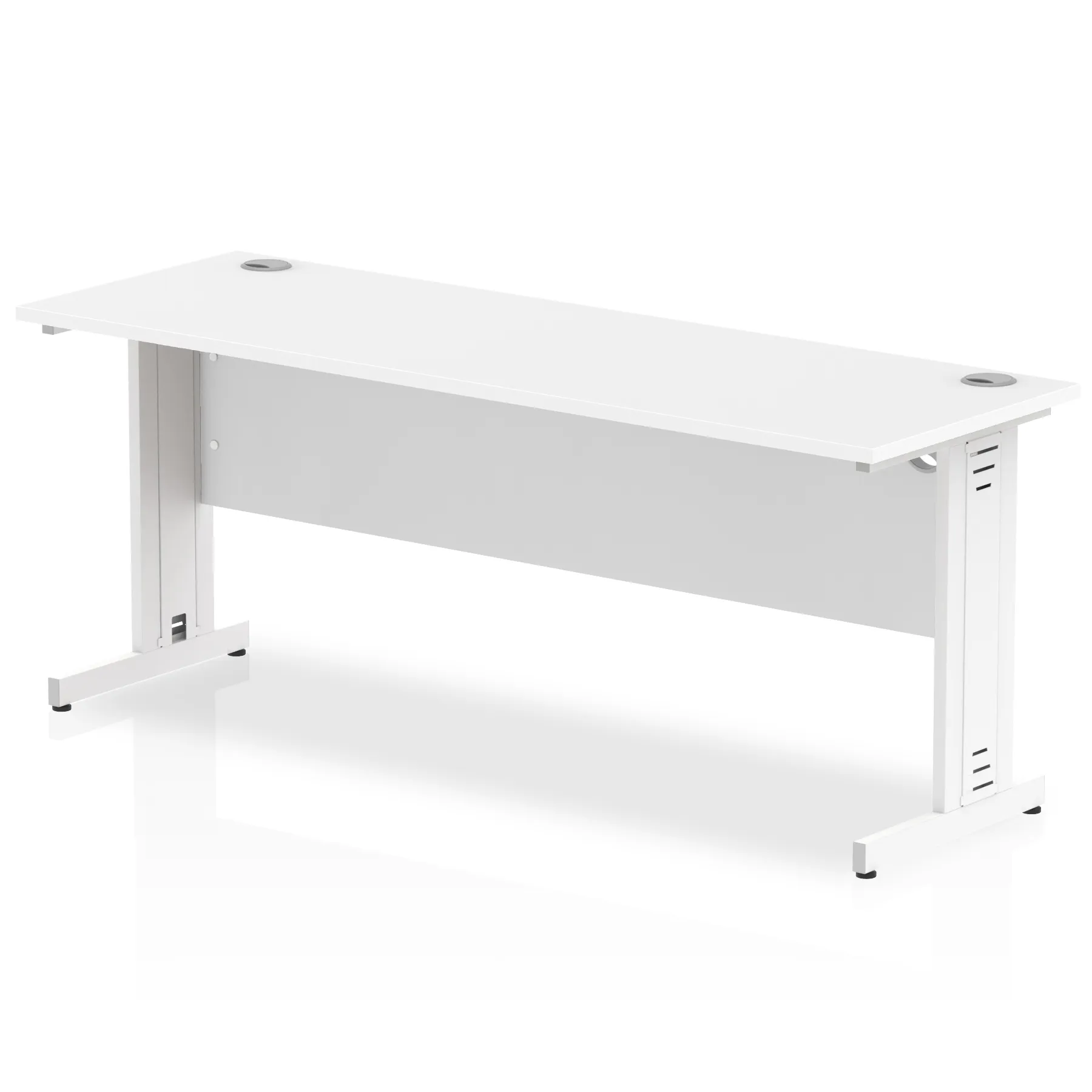 Impulse contract desk | 25mm tops | Heat resistant melamine finish | 18mm modesty panels | 2mm protective abs edging | Silver coated cable managed legs | 2 cable ports | Height adjustable feet | Steel to steel fixings | 2 modesty panels slots| Deep set modesty panel (5″) allows for compatibility of most screen clamp fittings | Weight Capacity 135Kg