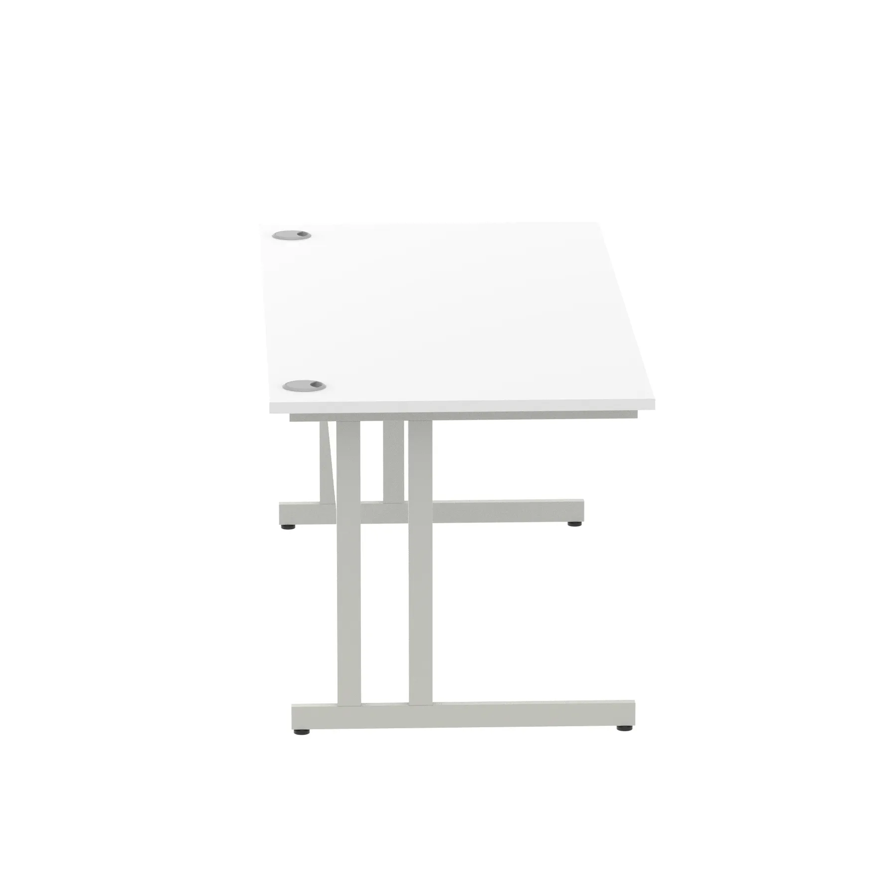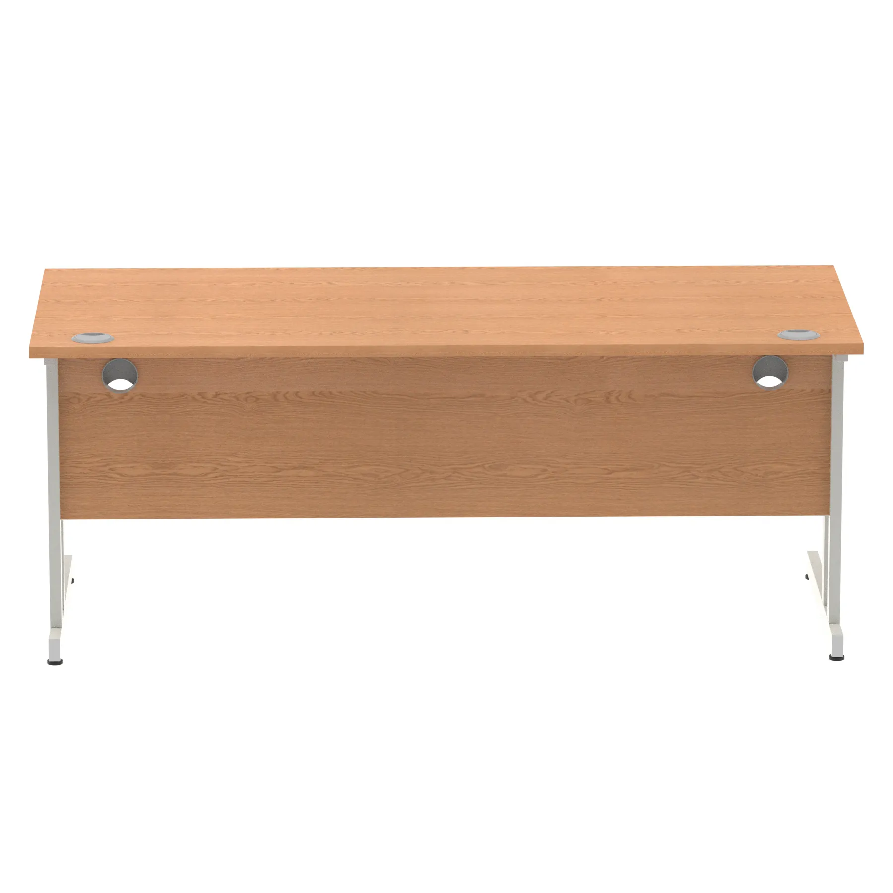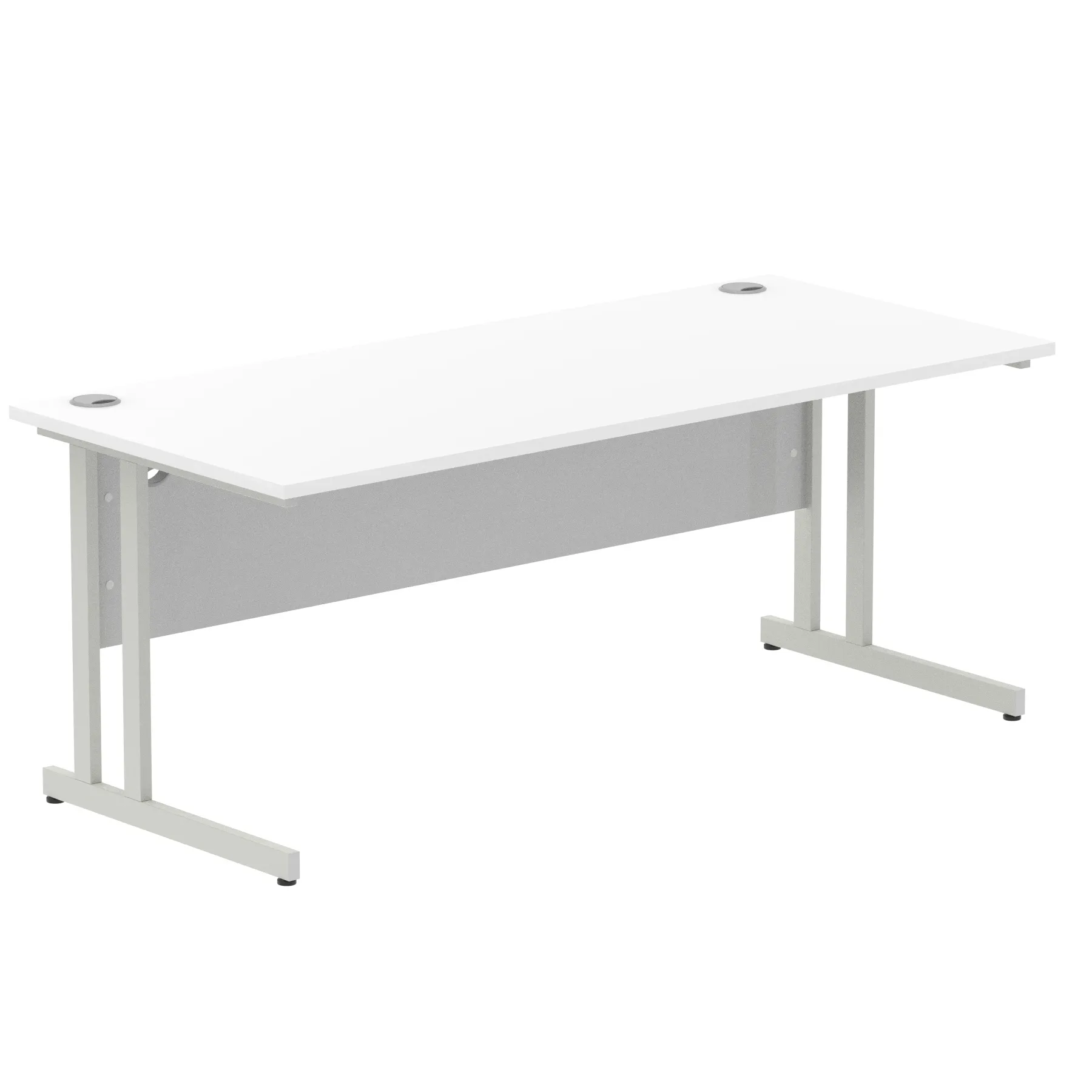 Impulse contract desk | 25mm tops | Heat resistant melamine finish | 18mm modesty panels | 2mm protective abs edging | Double strut legs | 2 cable ports | Height adjustable feet | Steel to steel fixings | 2 modesty panels Ports| Deep set modesty panel (5″) allows for compatibility of most screen clamp fittings | Weight Capacity 135Kg