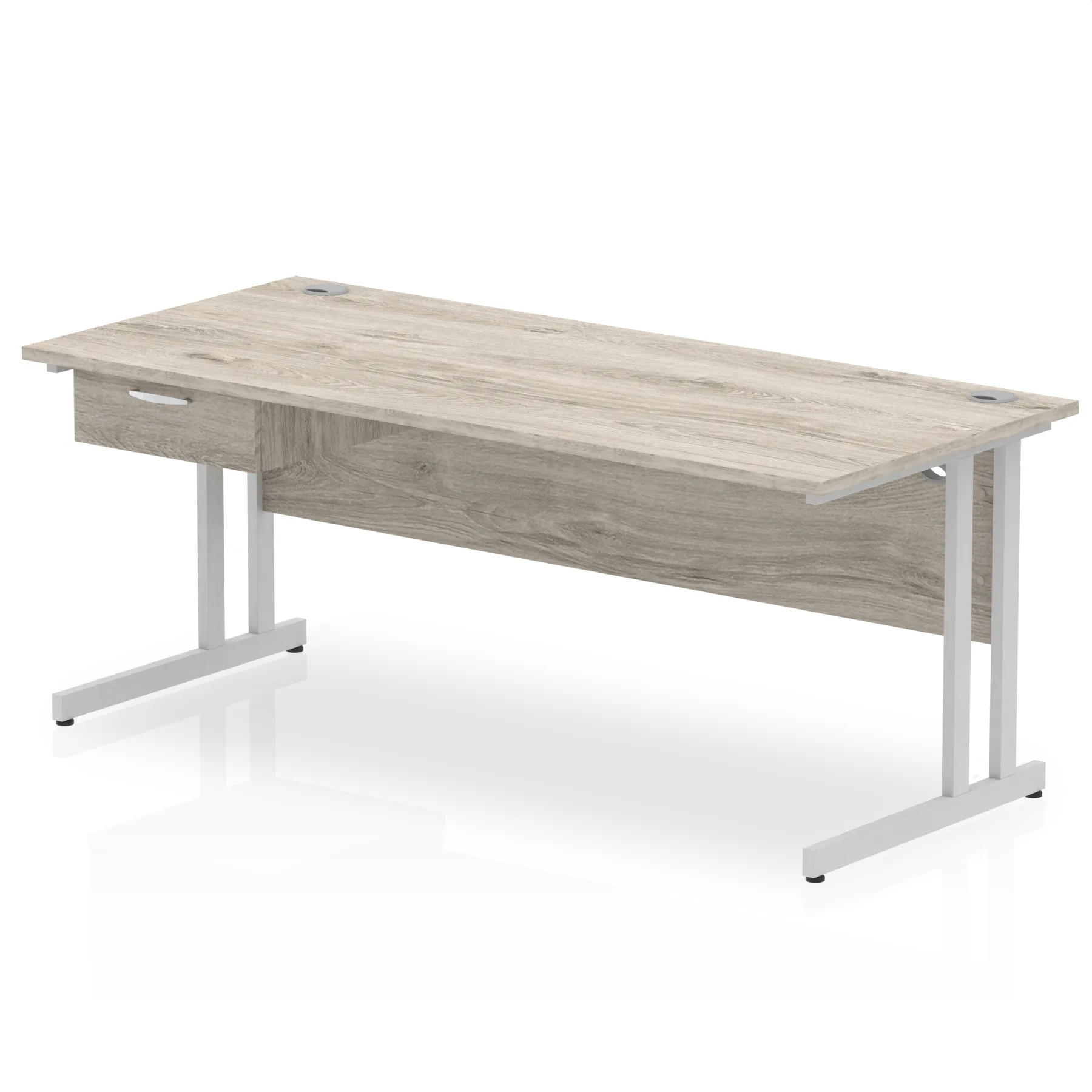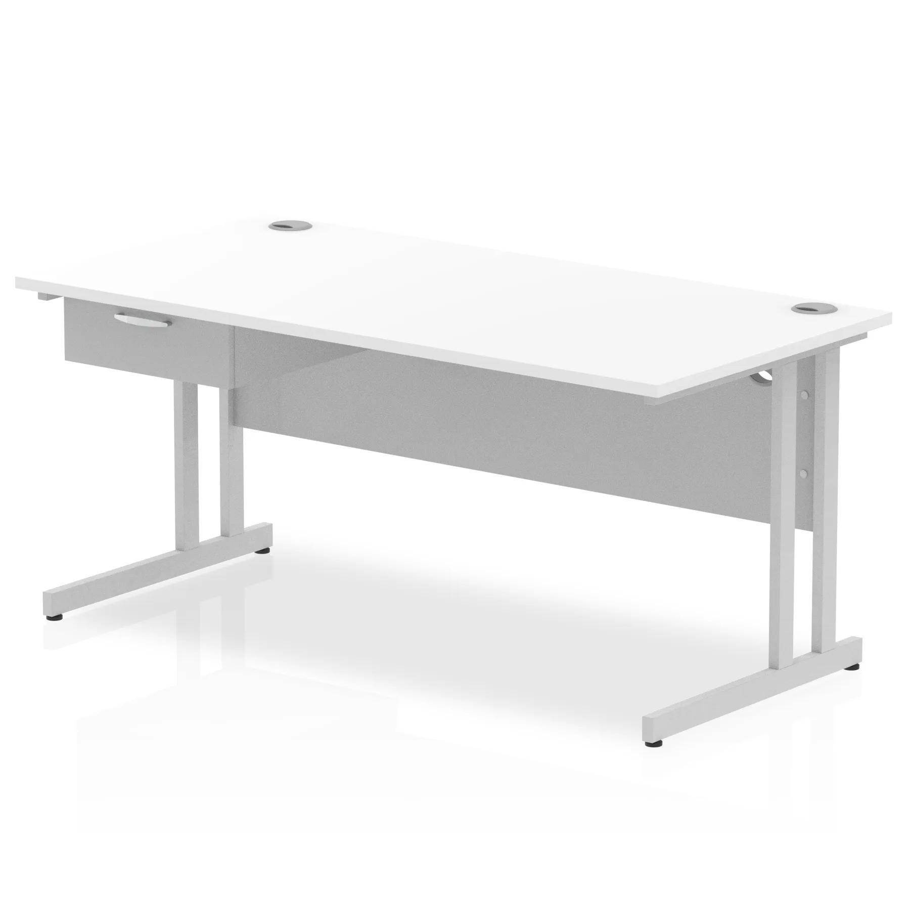 • Impulse contract desk • 25mm tops • Heat resistant melamine finish • 18mm modesty panels • 2mm protective abs edging • Double strut legs • 2 cable ports • Height adjustable feet • Steel to steel fixings • 2 modesty panels slots • Deep set modesty panel (5) allows for compatibility of most screen clamp fittings • Weight Capacity: 135Kg • Fixed pedestal