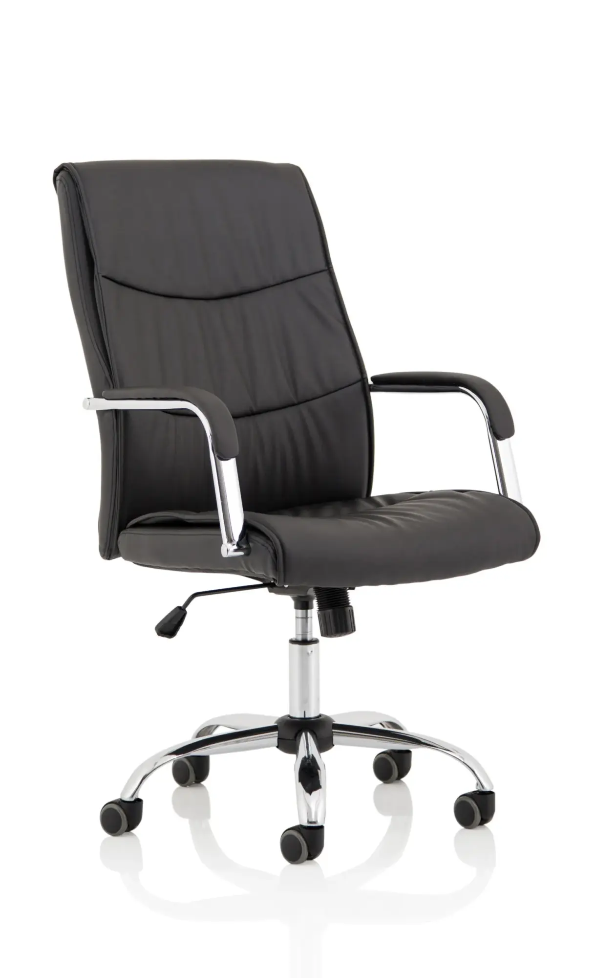 Luxury at a fraction of the usual cost. This high back Carter chair in faux leather has stitch detailing, deep foams and a padded armrest on a chrome frame. A clear case of Get Carter.