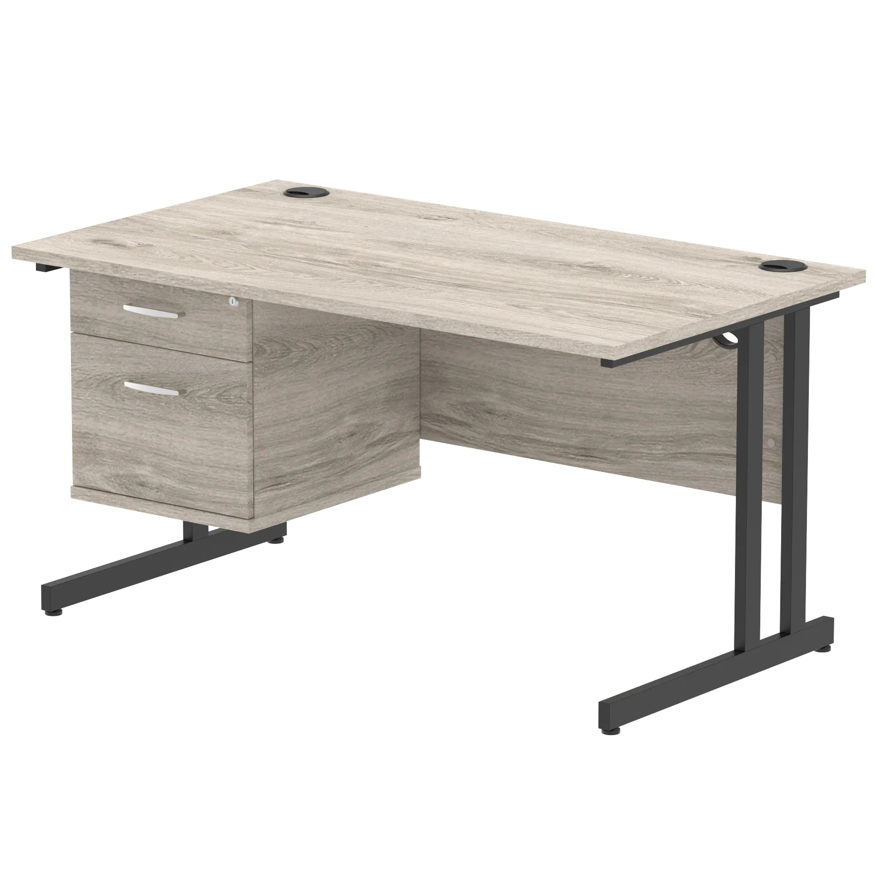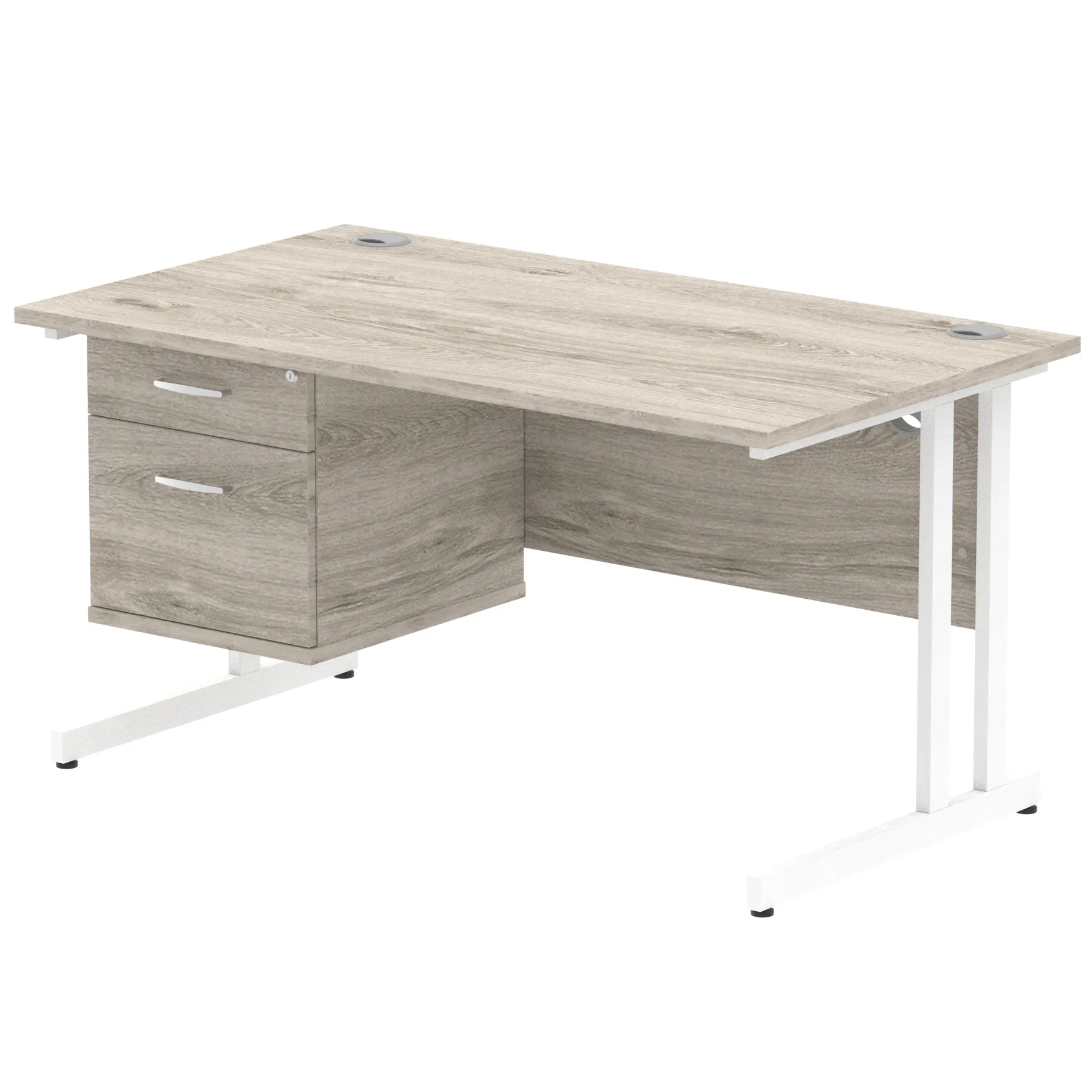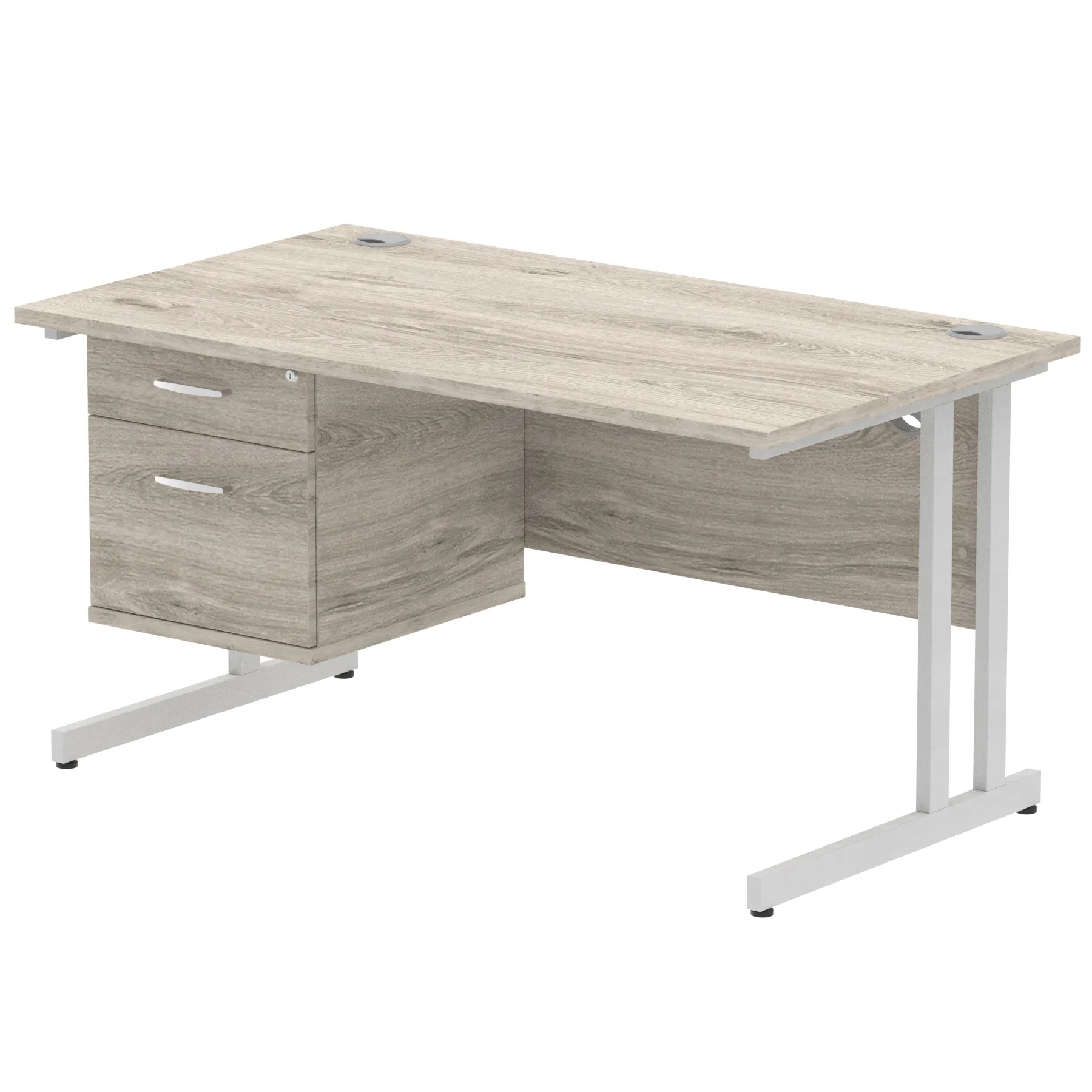 • Impulse contract 1400 wide desk • 25mm tops • Heat resistant Beech melamine finish • 18mm modesty panels • 2mm protective abs edging • White coated double strut legs • 2 cable ports • Height adjustable feet • Steel to steel fixings • 2 modesty panels slots • Deep set modesty panel (5”) allows for compatibility of most screen clamp fittings • Fixed pedestal