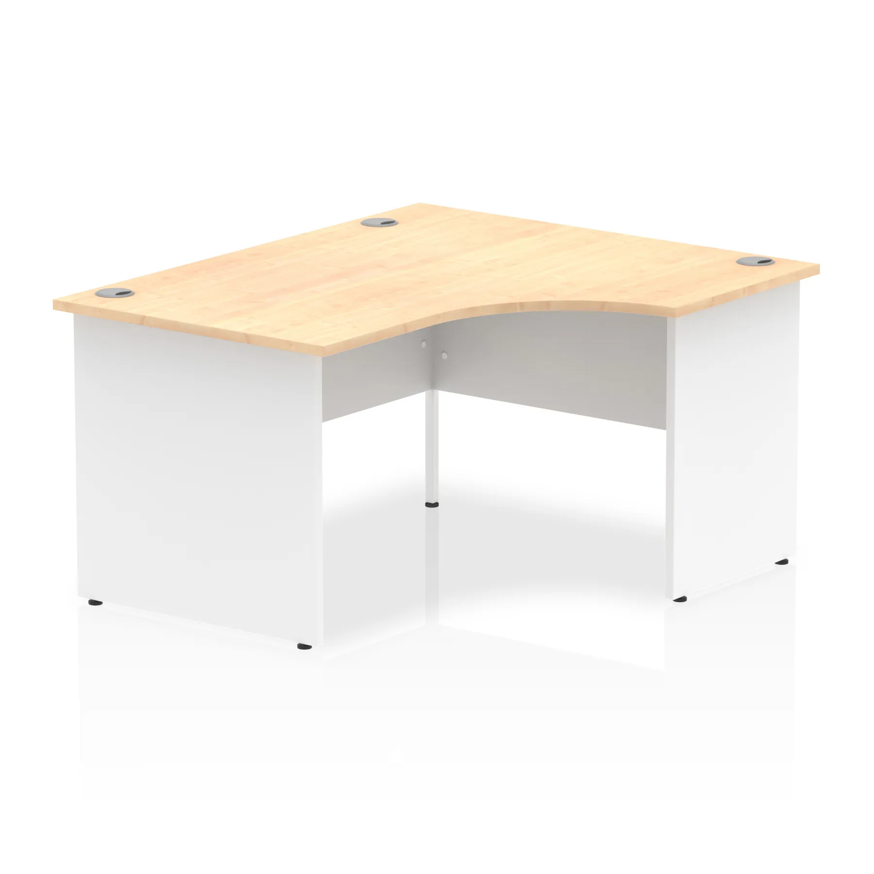 Impulse contract 1400 wide crescent desk | 25mm tops | Heat resistant beech melamine finish | 18mm modesty panel | 2mm protective abs edging | Matching wood panel end legs | 3 cable ports | Height adjustable feet | Steel to steel fixings | 3 modesty panel slots | 600 deep | Deep set modesty panel (5″) allows for compatibility of most screen clamp fittings | Weight Capacity 135Kg