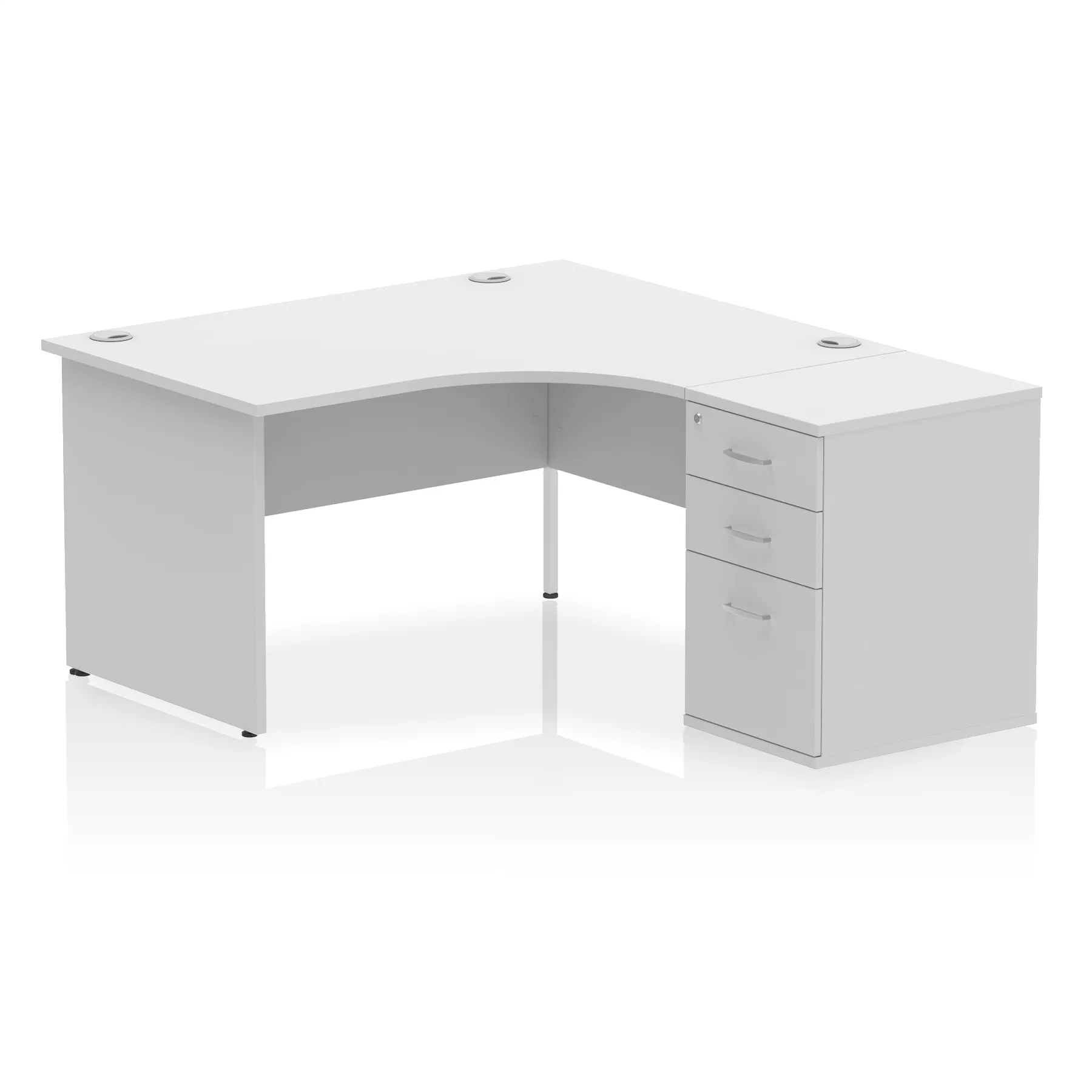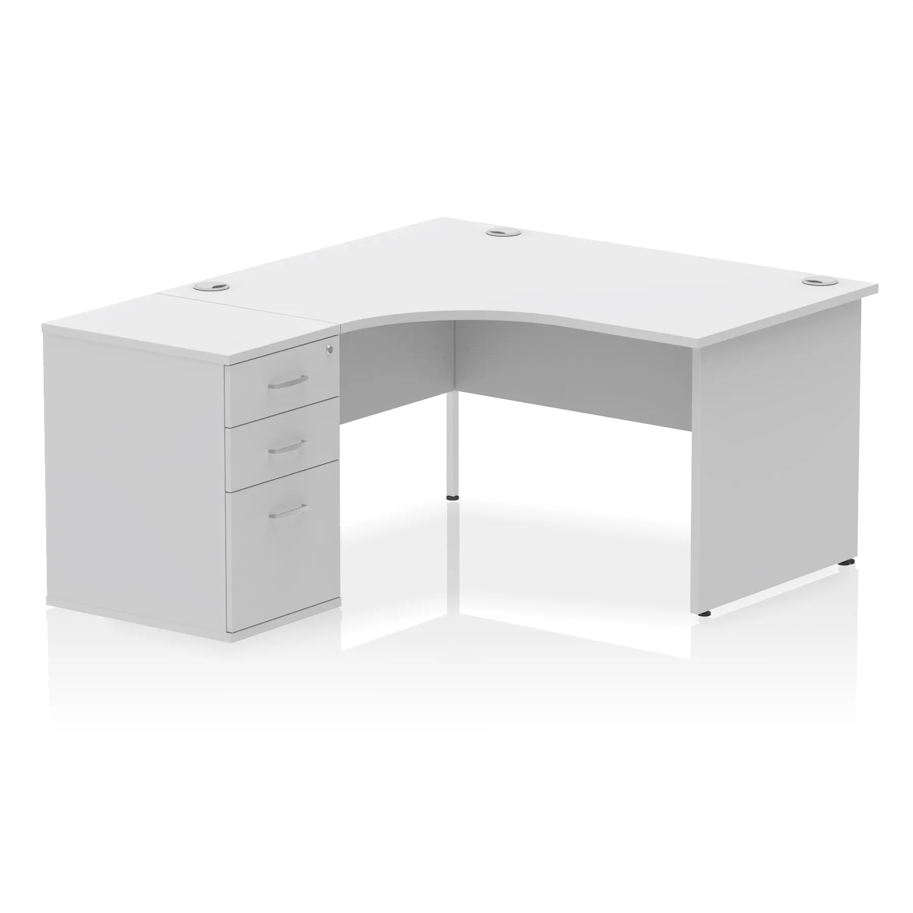 Impulse contract workstation | 25mm tops | Desk and pedestal combined | Heat resistant beech melamine finish | 18mm modesty panel | 2mm protective abs edging | Matching panel ends | Multiple cable ports | Height adjustable feet | Steel to steel fixings | Modesty panel slots wire slots| Deep set modesty panel (5″) allows for compatibility of most screen clamp fittings