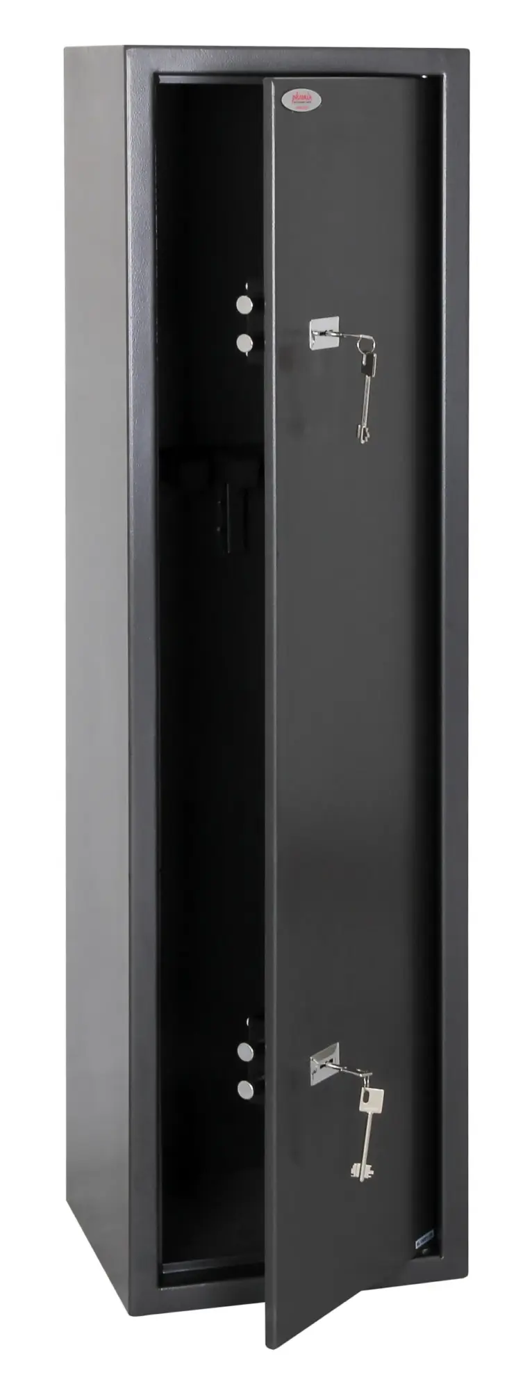 SECURITY PROTECTION – Tested to British Standard BS7558/92. 100% Police Approved | NO. OF GUNS – 1, 2 or 6 | LOCKING – Two high security 7 lever locks supplied with two double bitted keys | CONSTRUCTION – Galvanised steel body and door. High density foam divider and floor mat | FIXING – Ready prepared for fixing to the floor or wall, with fixing bolts supplied | COLOUR – Finished in a high quality durable Metallic Graphite paint.